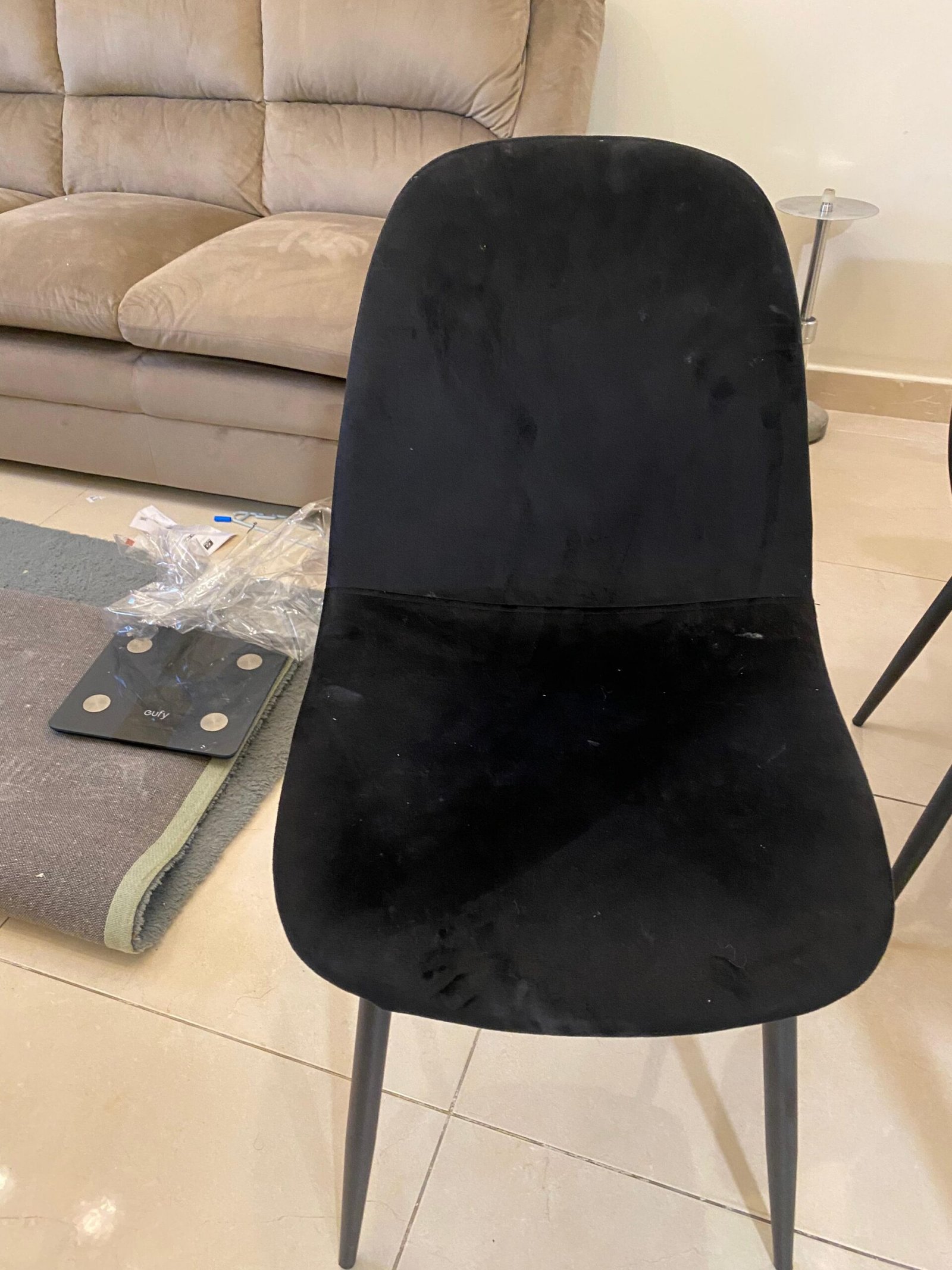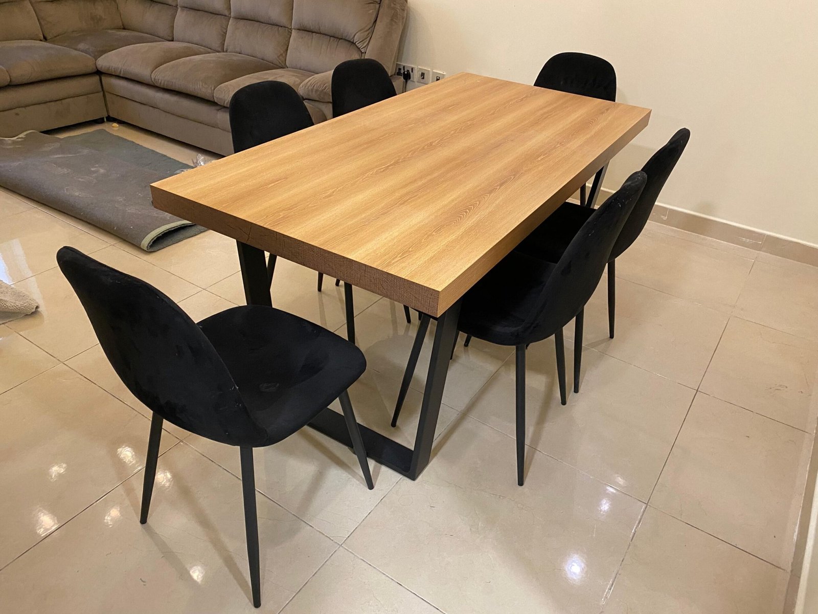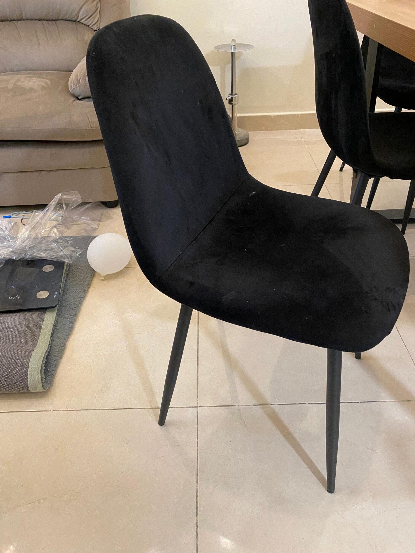 This dining set has been gently used for only one year and remains in excellent condition. There are no scratches, stains, or damage to the tabletop or chair upholstery. The metallic legs and base are free of scuffs and rust. It has been well-maintained and is ready to become the heart of your new home.