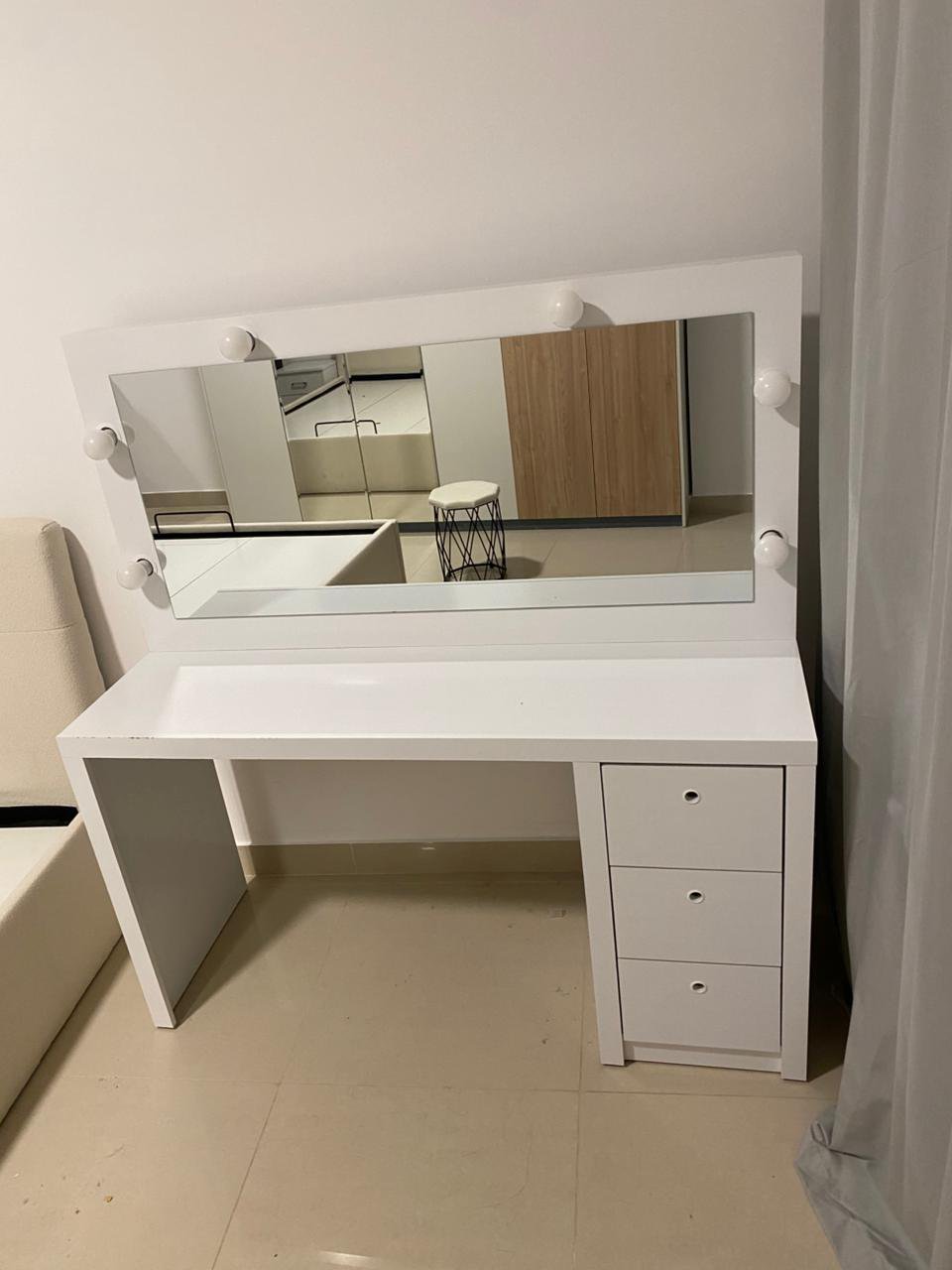 Lightly used and well cared for—no stains, scratches, or defects. Fully functional lighting and drawers, ready to style and use immediately.