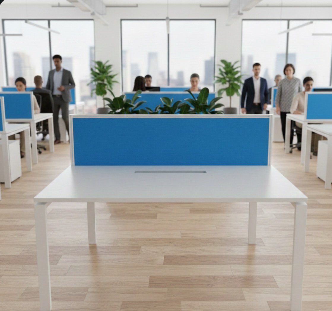 ✅ Central Blue Privacy Screen – A fabric-covered modesty panel positioned between the two work surfaces provides visual separation, reduces distractions, and adds a professional accent of color.