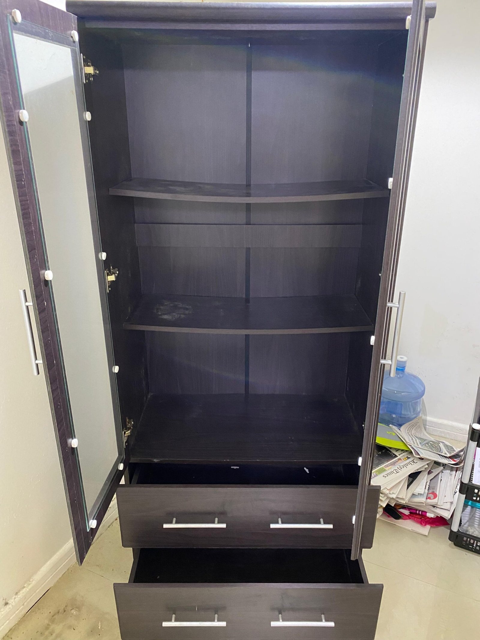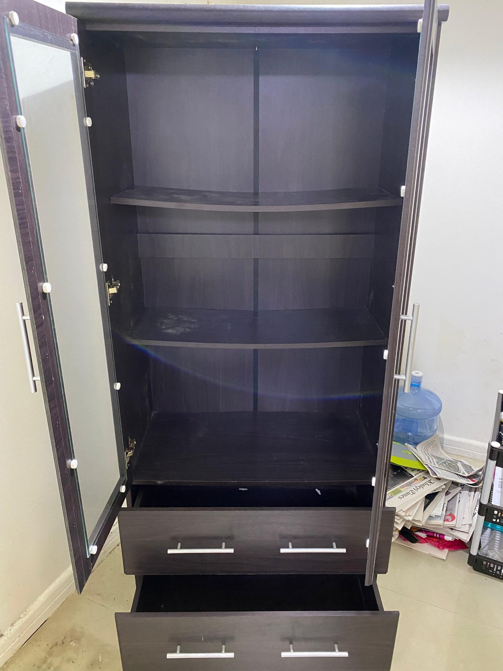 Add a touch of modern organization to your bedroom with this elegant and highly functional 2-door wardrobe from Home Box. Crafted from durable engineered wood in a rich dark brown finish, this piece combines practical storage with stylish design. Featuring a unique glass-panel display section and four smooth pull-out drawers, it offers the perfect blend of open visibility and discreet organization—all in excellent, ready-to-use condition.