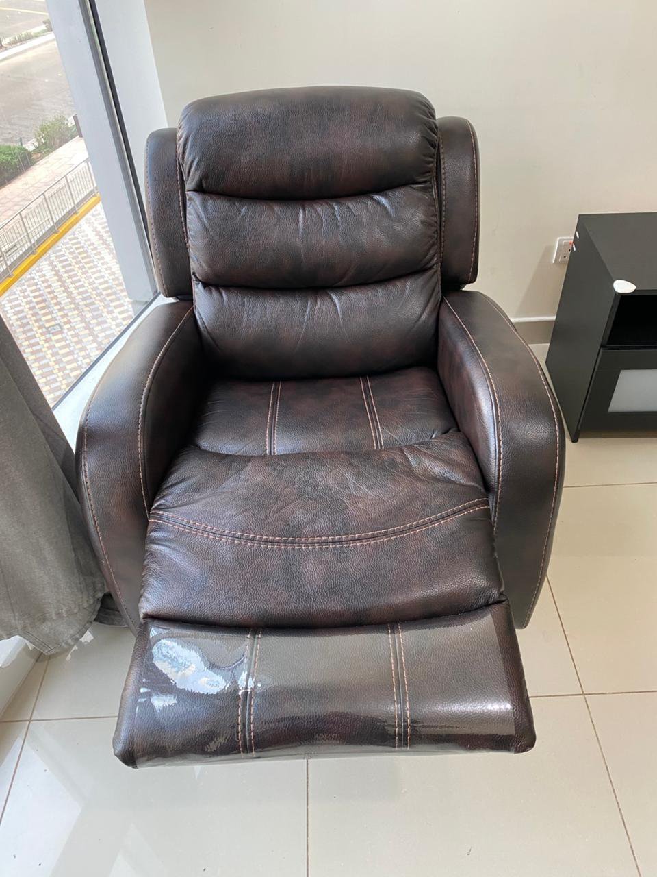 Experience ultimate relaxation with the ‘Chaplin’ Rocking Recliner from Home Centre. This stylish and versatile chair combines the gentle motion of a rocker with the luxurious comfort of a recliner, all wrapped in a sophisticated dark teak faux leather upholstery. Used for only six months and maintained in pristine condition, it offers a perfect spot to unwind in your living room, bedroom, or home theater.