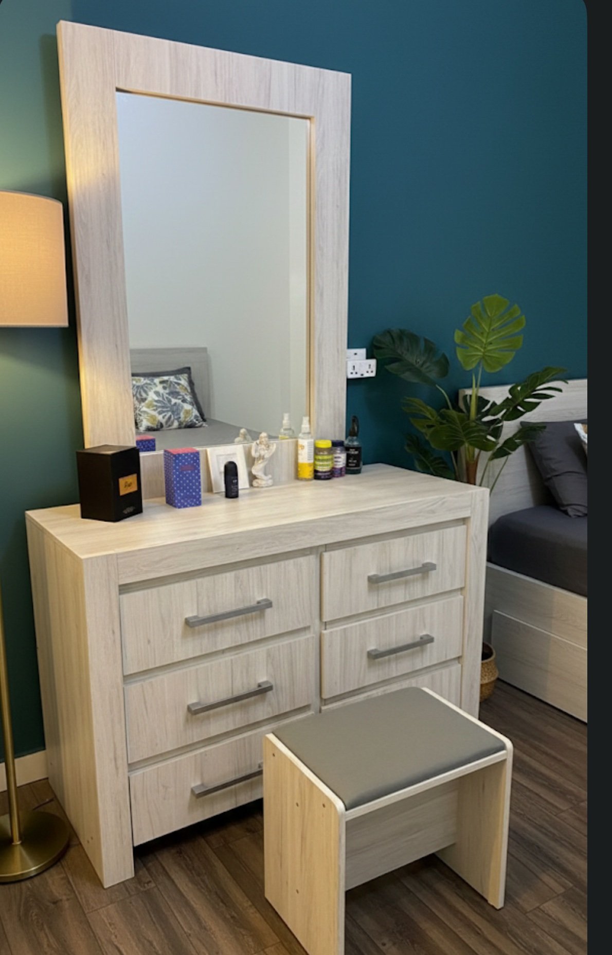 ✅ Complete 4-Piece Matching Set – Includes a King Bed Frame (180x200cm), Premium Mattress, 2 Nightstands, and a 6-Drawer Dresser with Mirror.