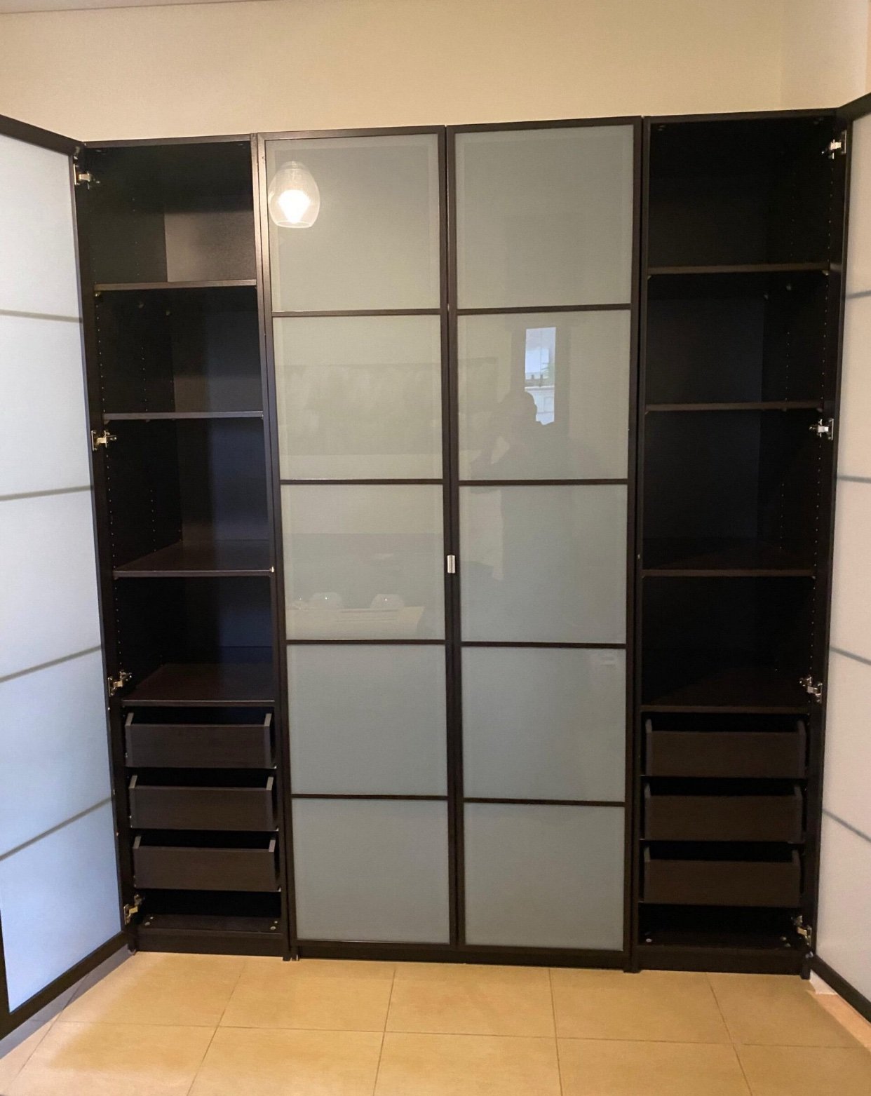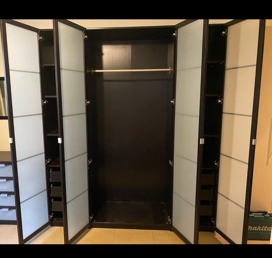 ✅ Spacious PAX 4-Door Wardrobe – Complements the set with a modern grey glass and black frame design, offering extensive hanging and shelving space.