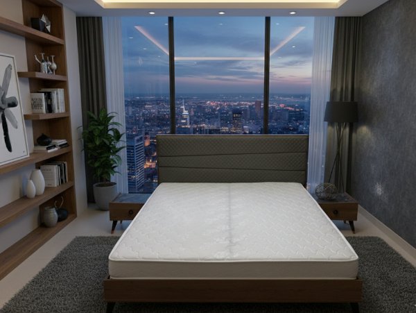 ✅ Quilted Olive Fabric Headboard – The upholstered headboard in a muted olive hue adds texture and softness, providing comfortable back support and a modern focal point.