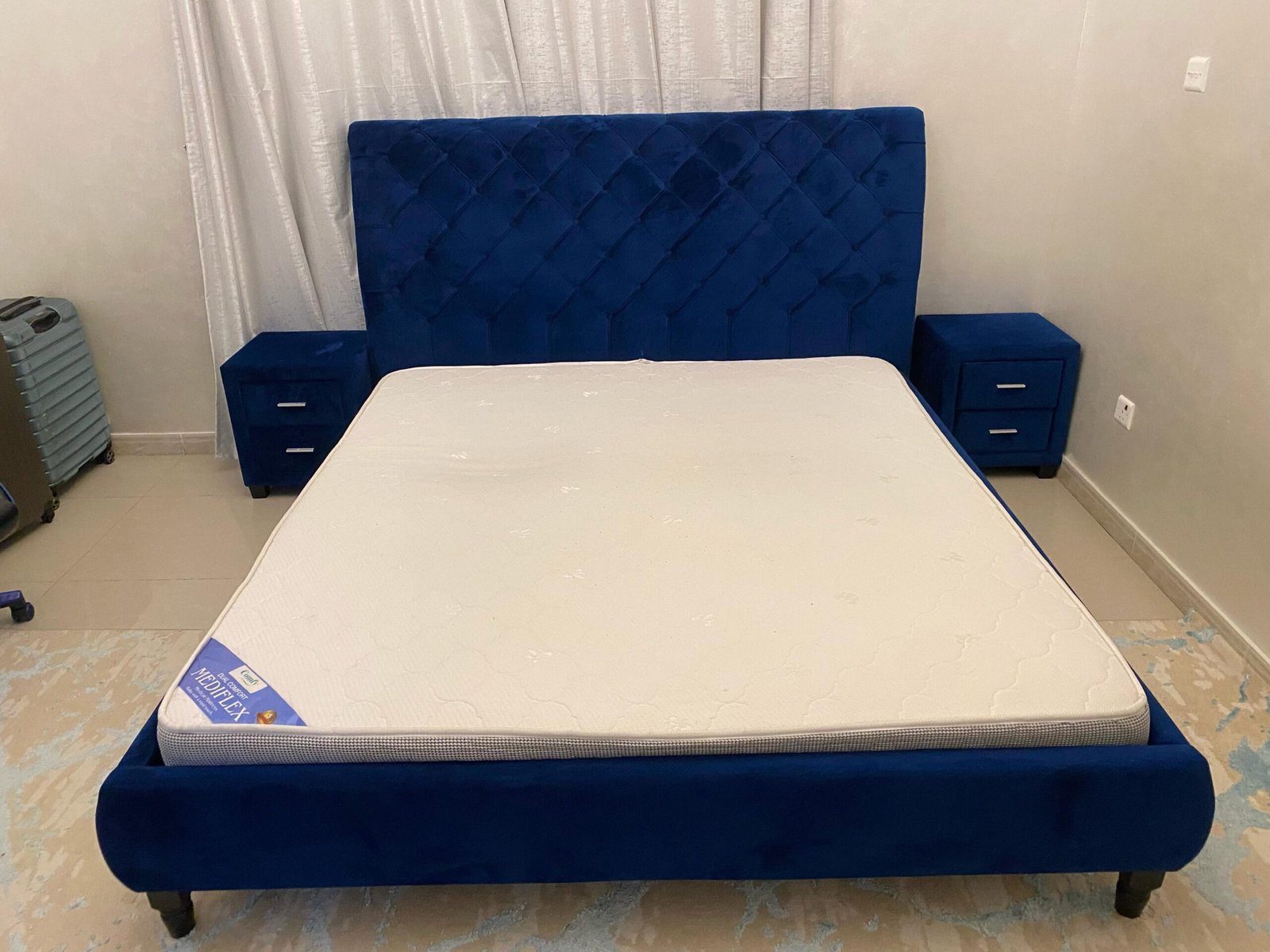Up for sale is a premium Home R Us king-size bed (180cm x 200cm) in a stylish blue wooden frame, offering both modern elegance and practical functionality. This sleek, contemporary-designed bed comes with a high-quality mattress that ensures superior comfort for a restful sleep.