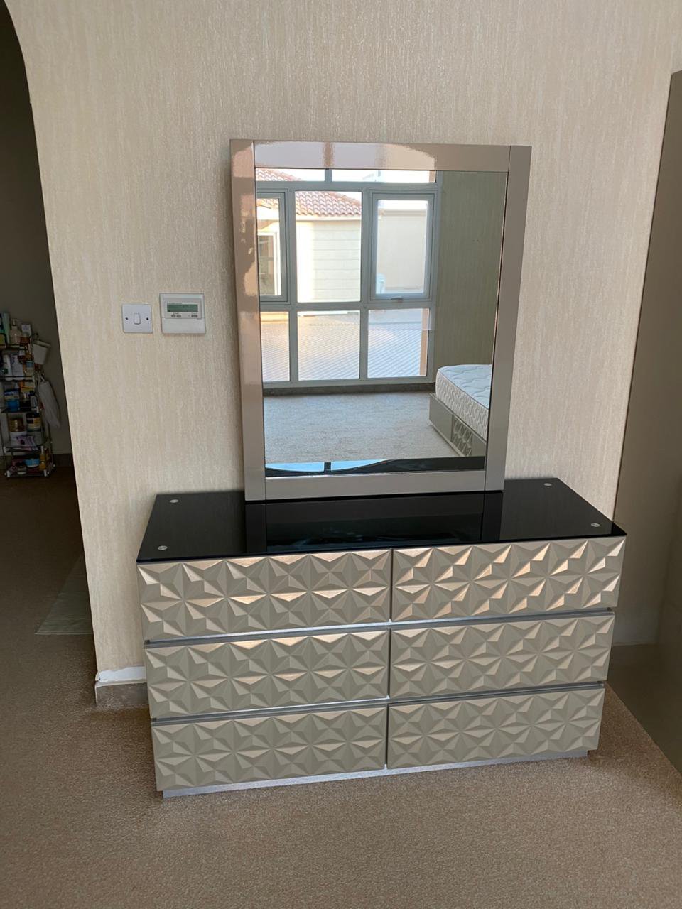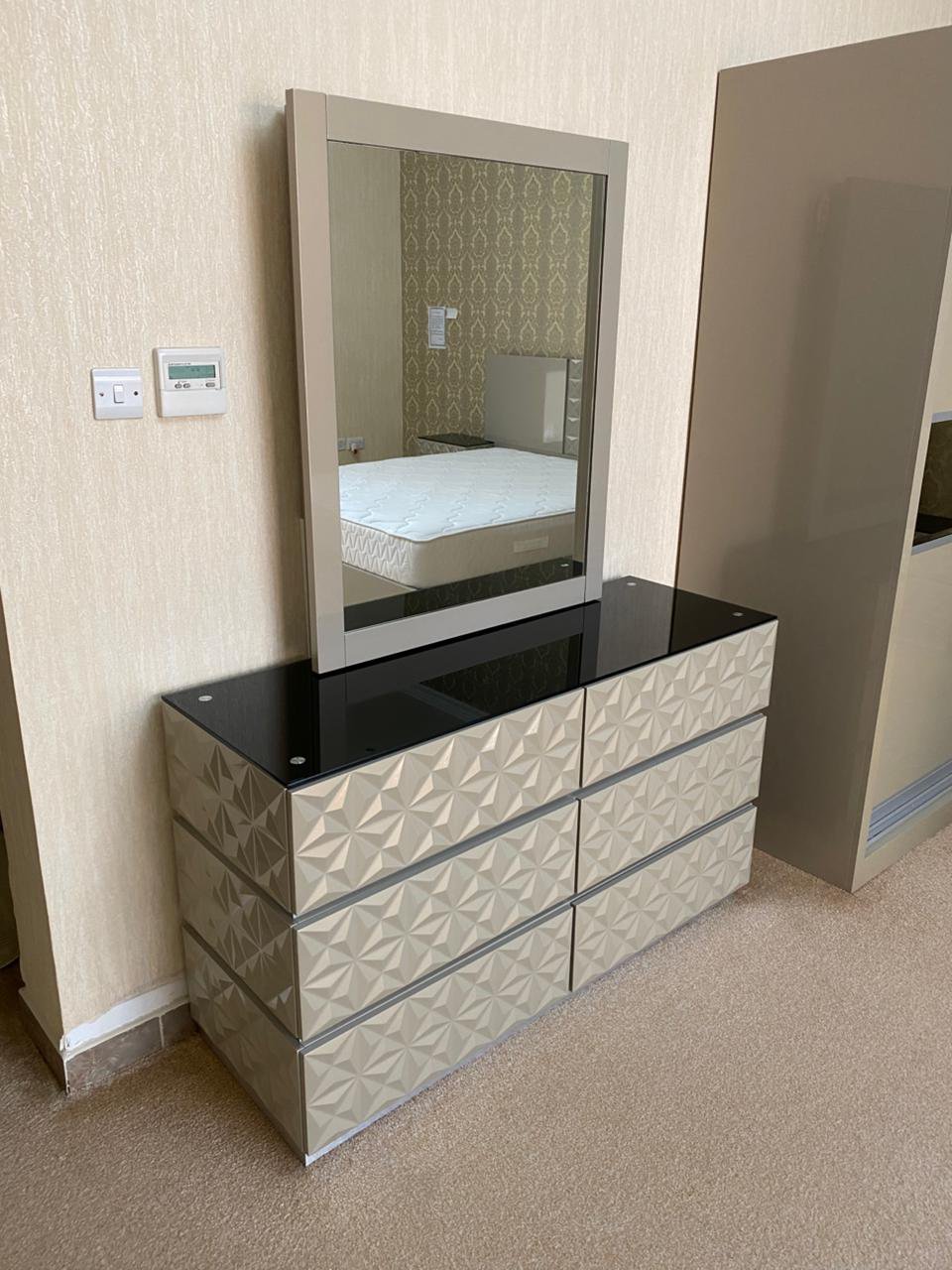 Experience the perfect harmony of modern style and practical living with this complete king bedroom set from Home Centre. Designed in a warm, sophisticated palette of beige and brown, this comprehensive collection includes a king-size bed frame (180×200 cm) with a high-quality mattress, two matching nightstands, a dresser with a mirror, and a spacious sliding-door wardrobe. Every piece is crafted for durability and contemporary elegance, creating a fully coordinated and luxurious bedroom retreat. In excellent, like-new condition after only six months of use, this set offers outstanding value and instant style.