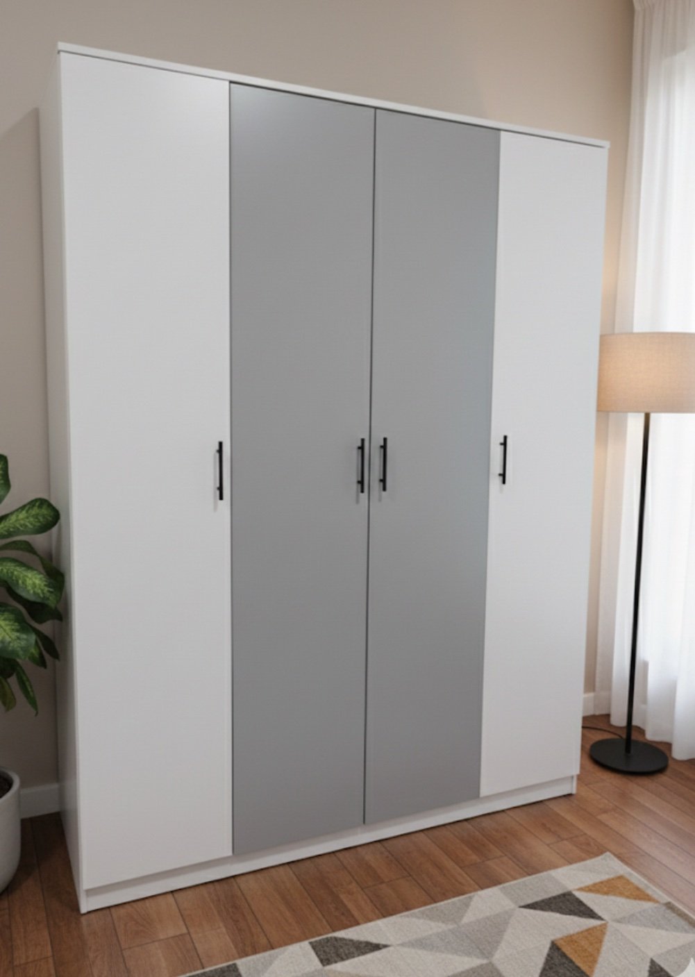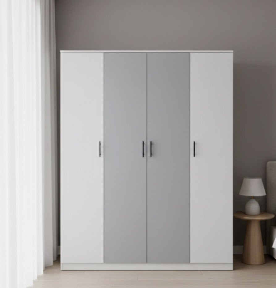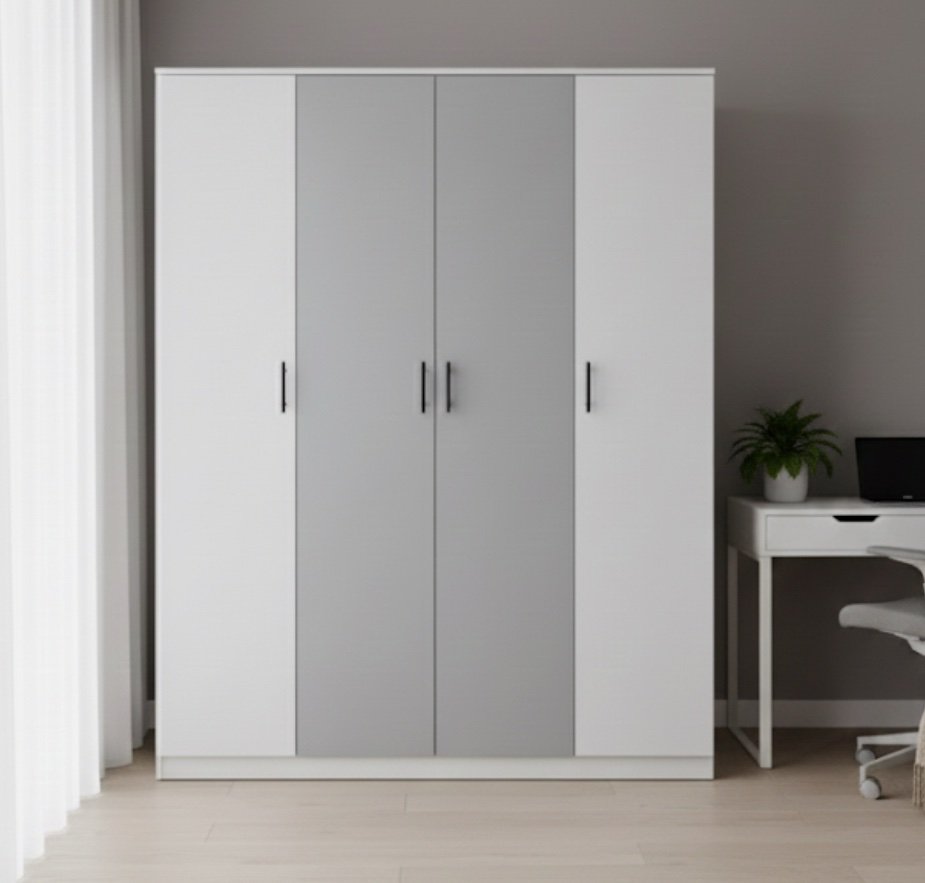 ✅ Spacious 4-Door Wardrobe – Features four hinged doors (white outer, grey middle) and provides ample storage with a mix of hanging space and internal shelving.