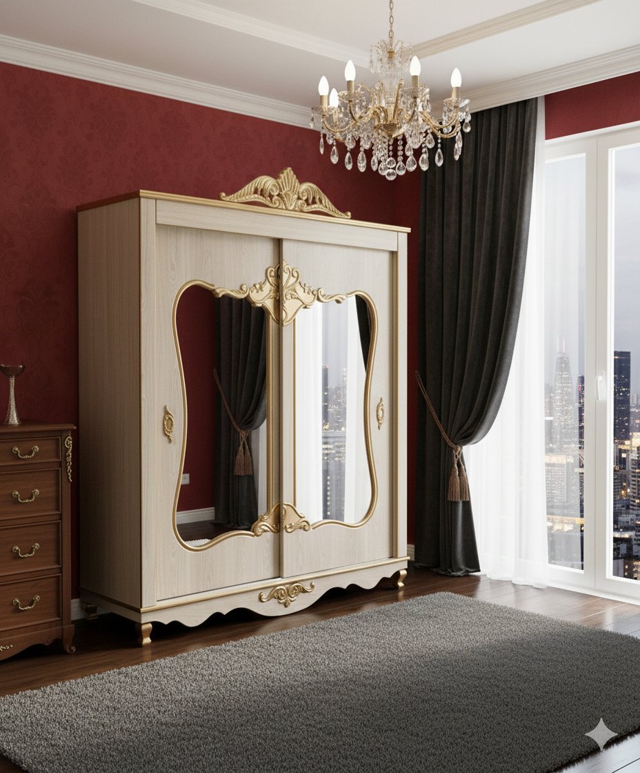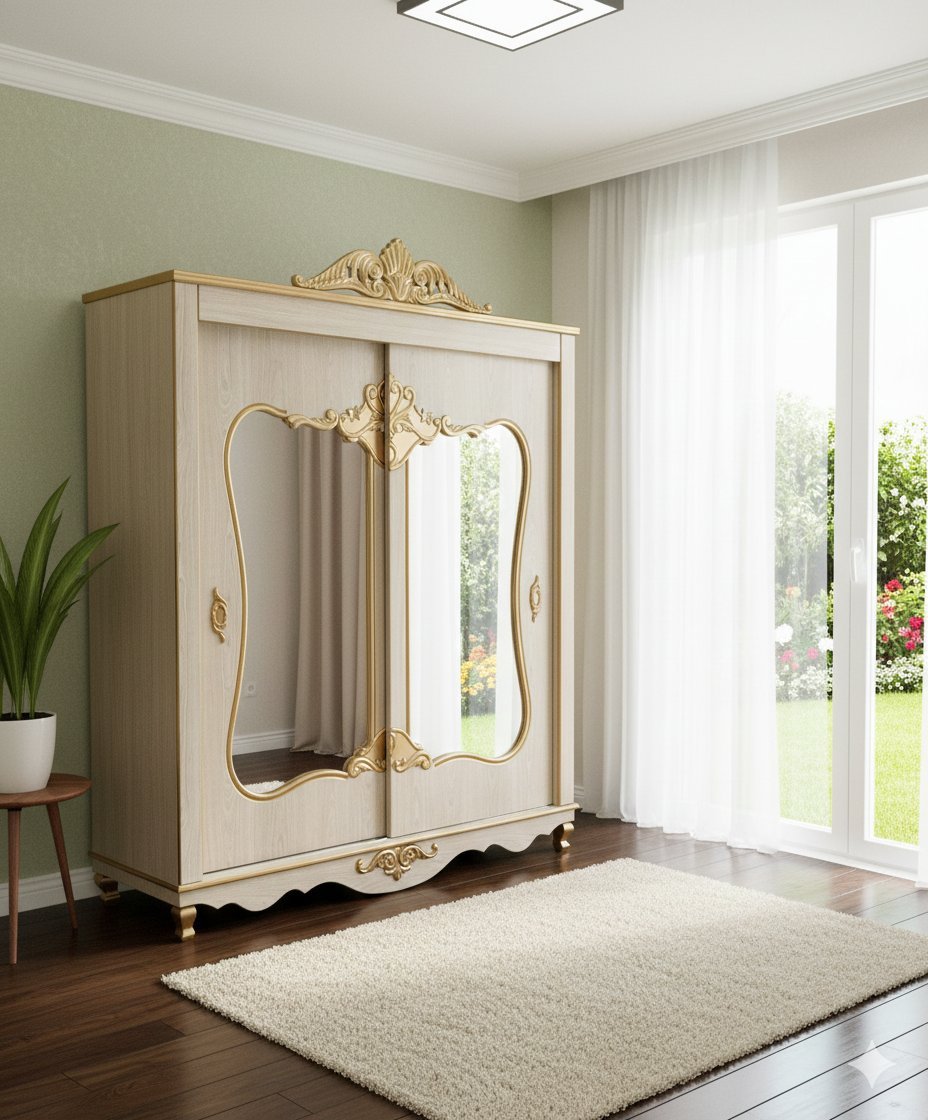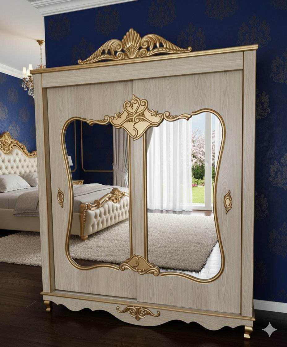 2 XL Ornate Luxury Wardrobe | Elegant Gold Carvings | Full-Length Mirror