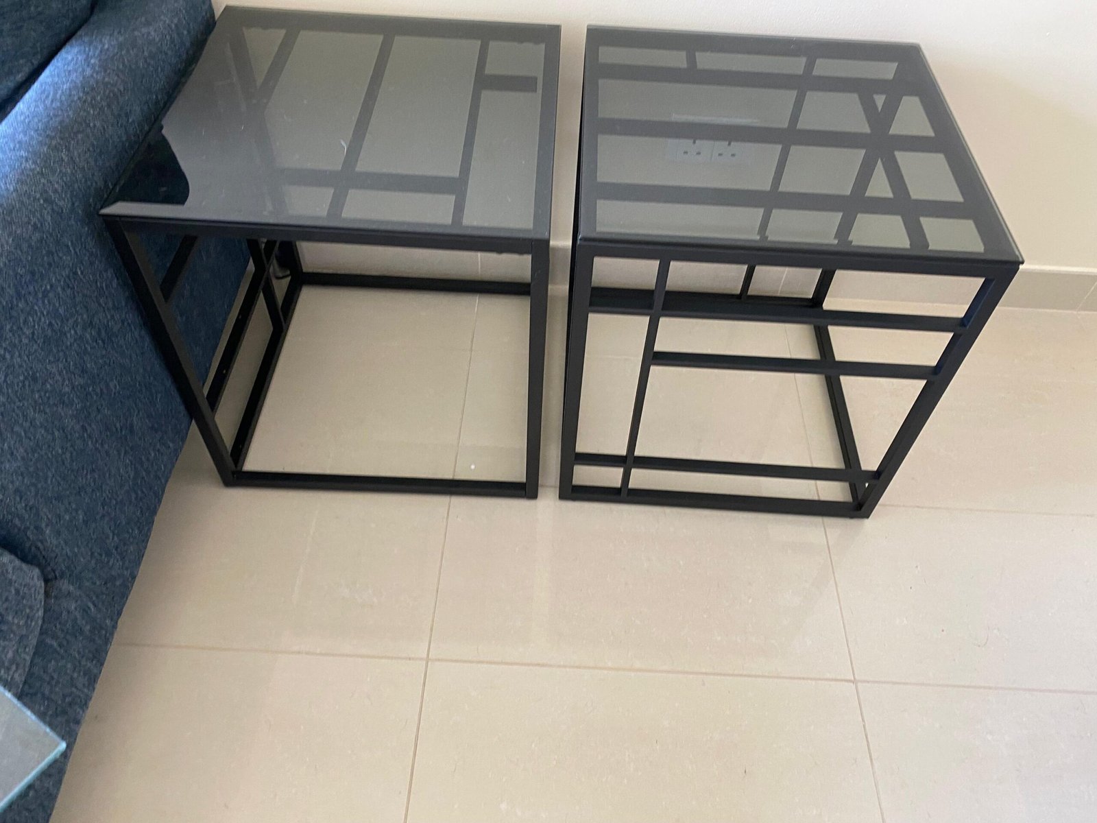 Up for sale is a stylish pair of modern coffee tables from Pan Home featuring a sleek glass top and a durable metallic base with a sophisticated black finish. These tables are strong, stable, and built to last, making them a perfect addition to any contemporary living space.
