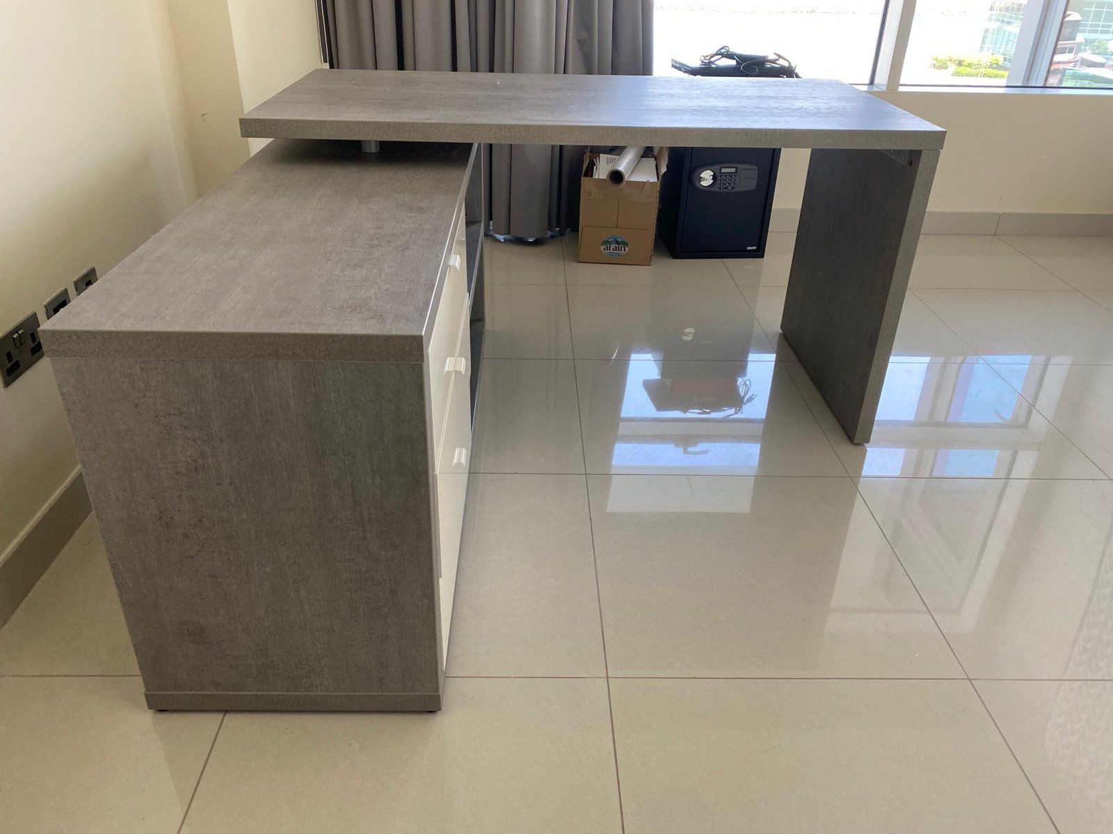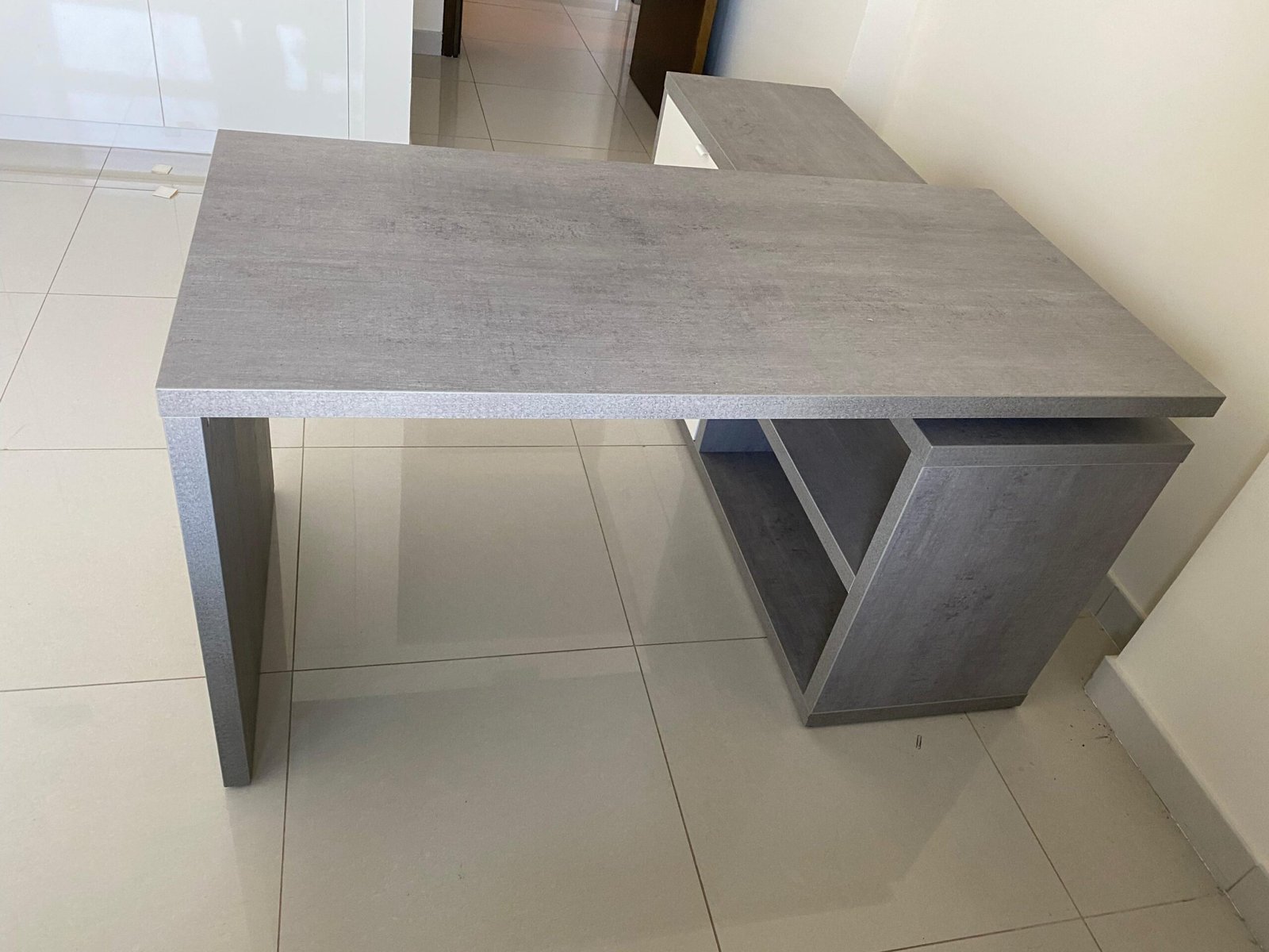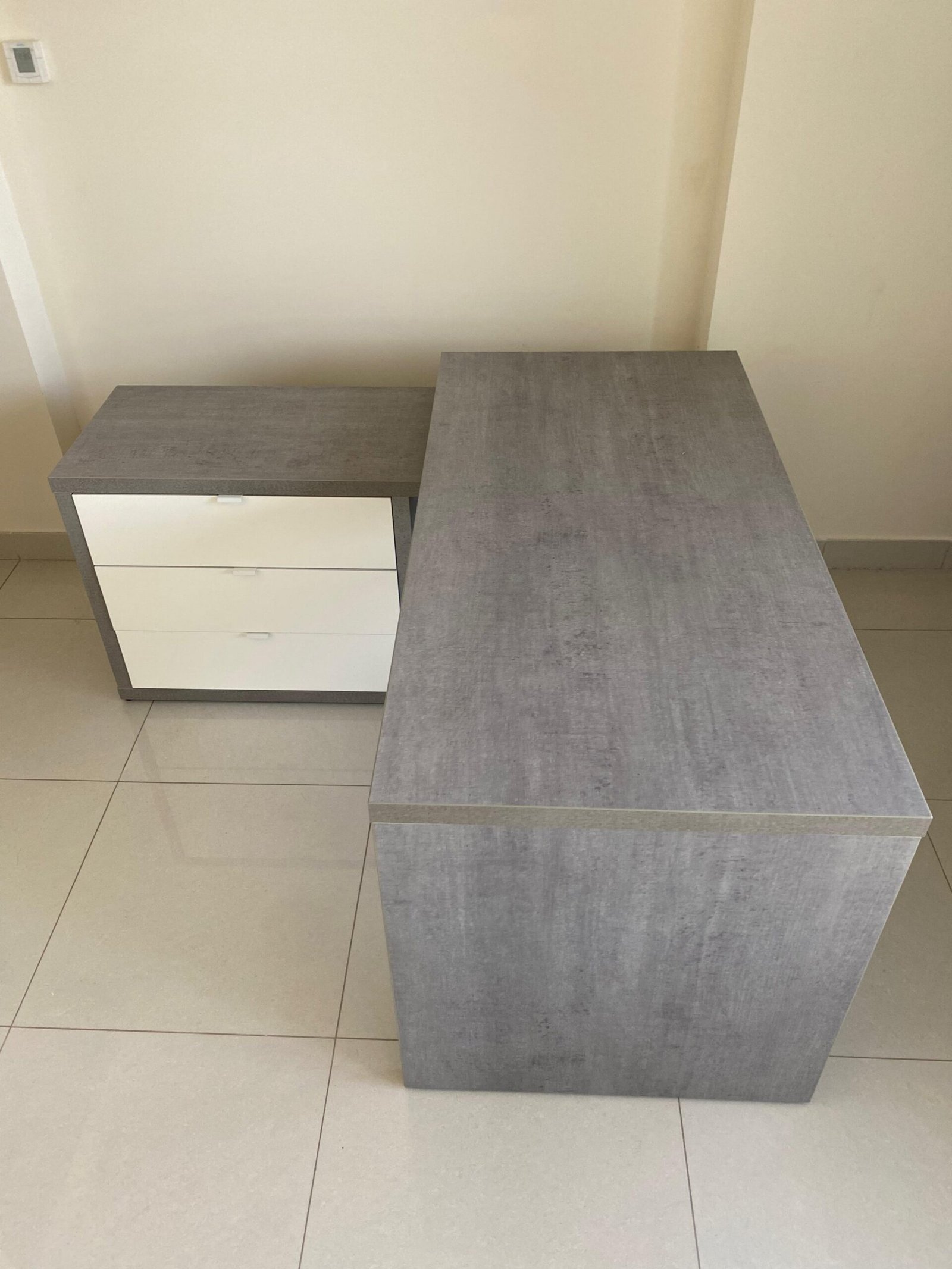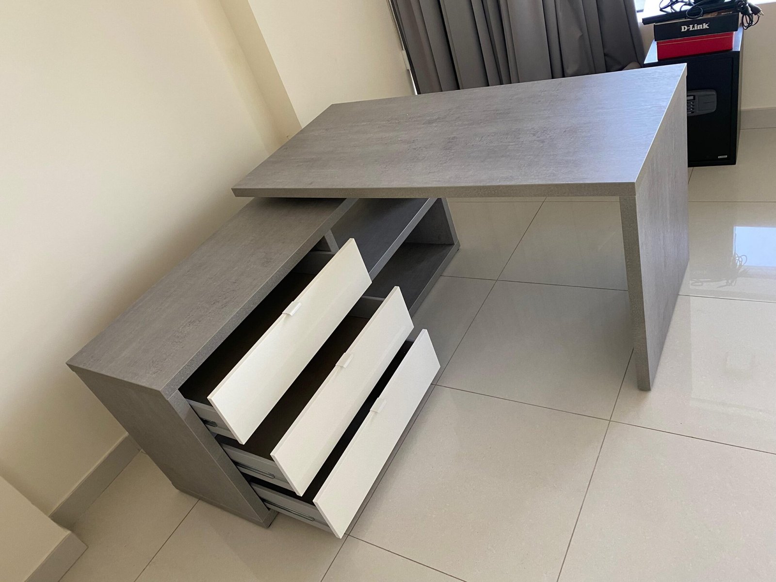 Elevate your work-from-home setup or professional office with this sleek and robust grey office table from Home Centre. Designed for modern efficiency, its spacious surface and contemporary grey wooden finish provide a perfect blend of style and substance. Crafted with durability in mind, this table offers a stable and generous workspace for computers, dual monitors, and all your essential tasks. In excellent, like-new condition after only four months of use, it presents an outstanding value for creating a productive and organized environment.