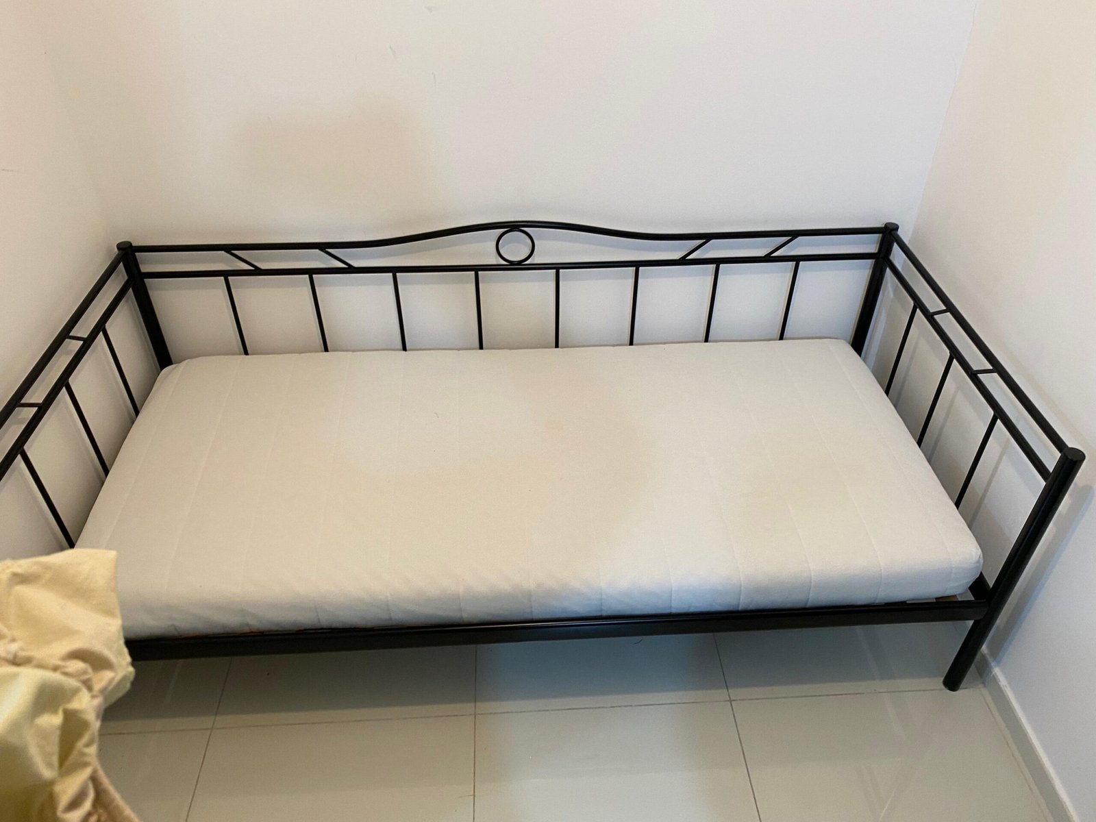 Create a sleek and modern sleeping space with this Single Bed Set from Pan Home. Featuring a bold black metal frame and a sturdy wooden base, this 90x200cm bed combines industrial durability with contemporary style. Complete with a comfortable mattress and used for just 4 months in excellent condition, it’s perfect for those seeking a robust and stylish sleeping solution.