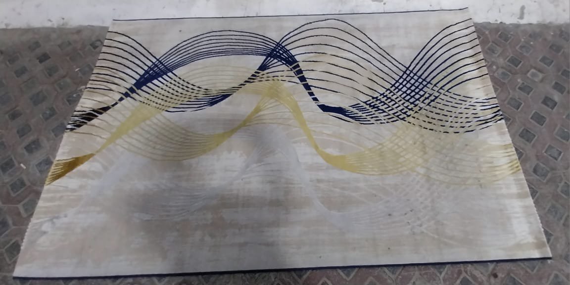 Elevate your space with this exquisite 230cm x 150cm (7’6” x 5’) modern abstract rug from Millant Center Rugs, Turkey. Boasting a luxurious cream-colored base, this piece features bold, flowing wavy patterns in rich dark blue and shimmering gold (or yellow) hues, creating a striking visual contrast that adds depth and sophistication to any room.