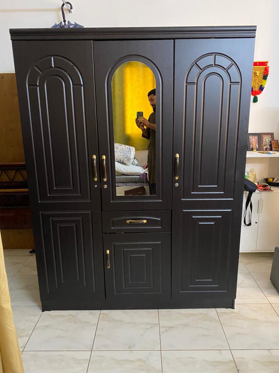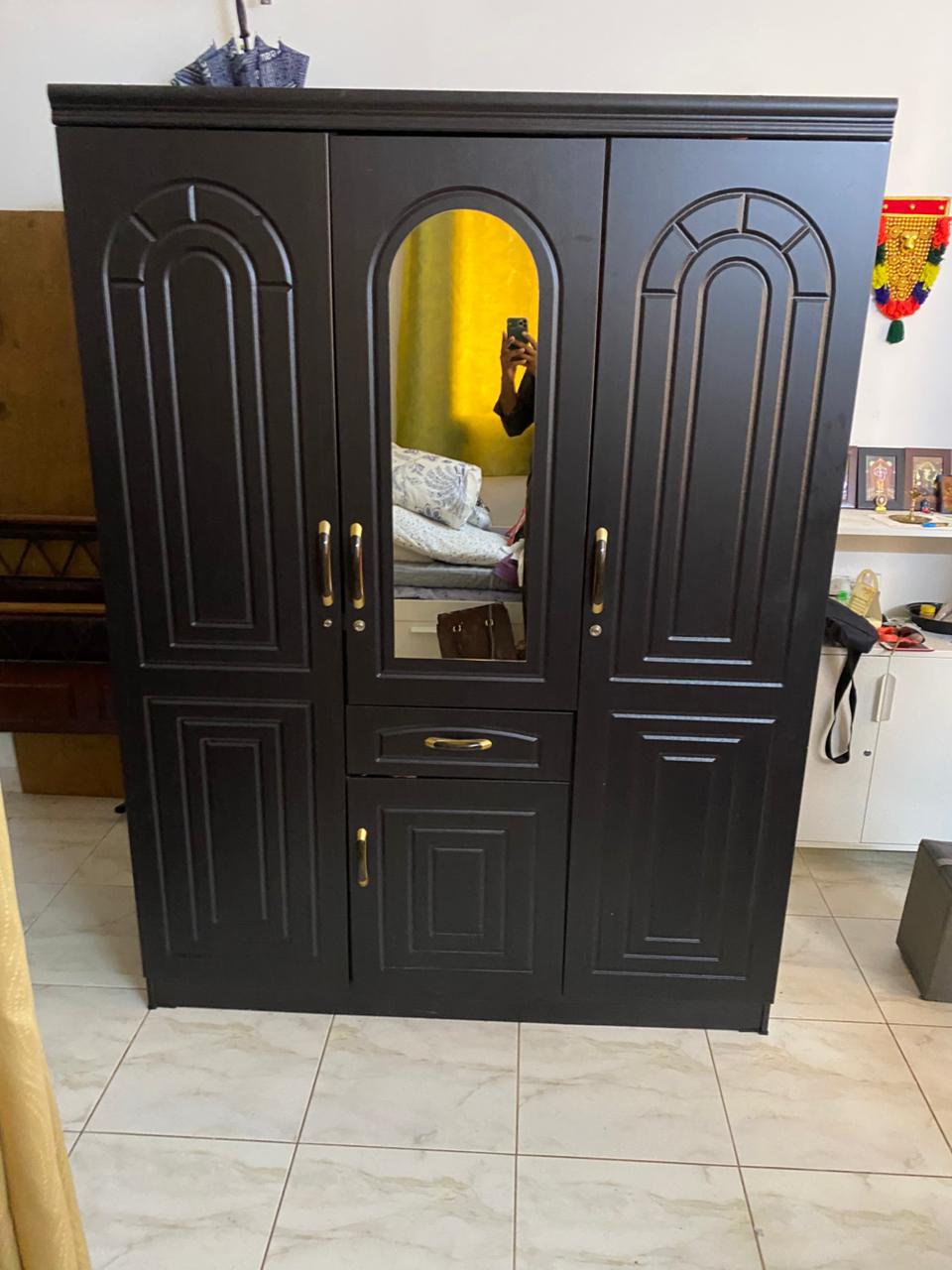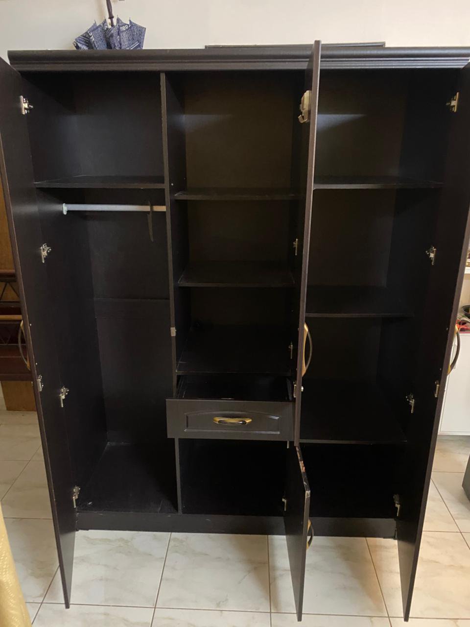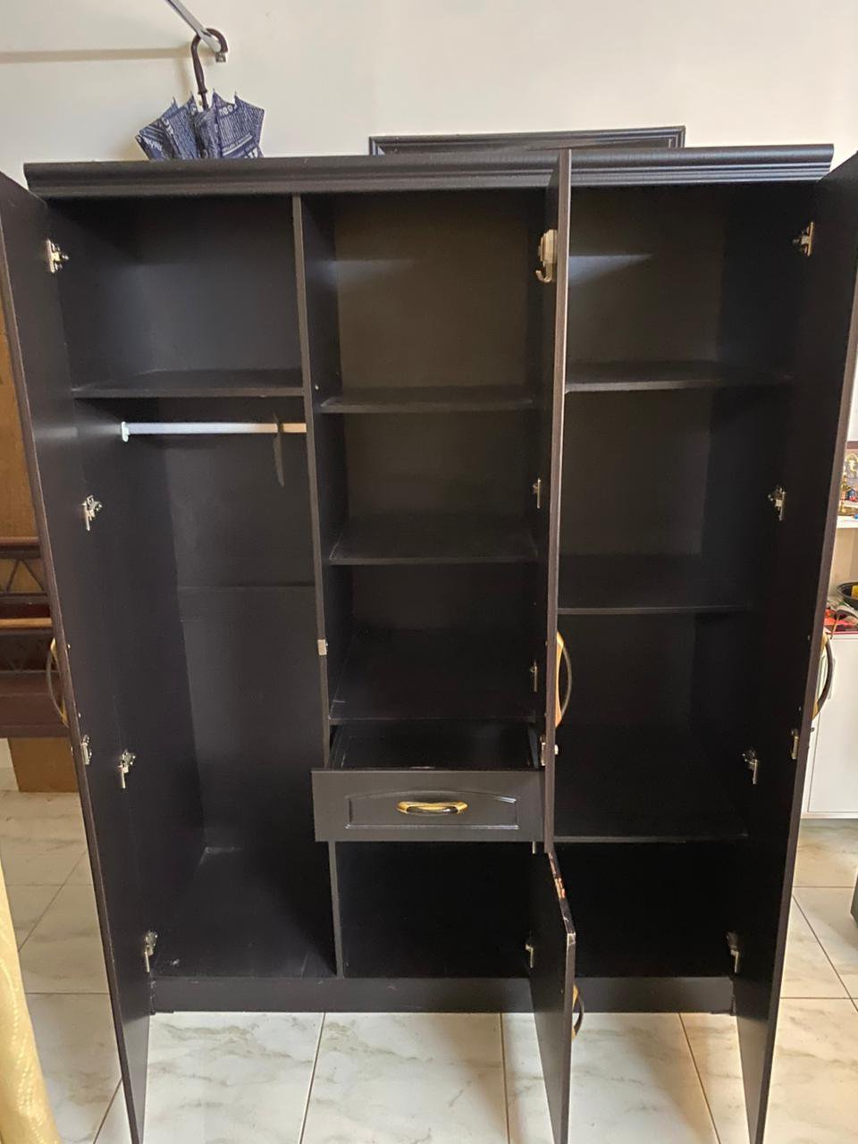 Elevate your bedroom with this sophisticated IKEA 3-door wardrobe, featuring a rich dark brown finish and elegant gold-toned handles. Designed for both style and functionality, the central door is fitted with a practical half-length mirror, perfect for your daily routine. With a thoughtfully organized interior for hanging and shelving, this wardrobe offers a luxurious storage solution in like-new condition.