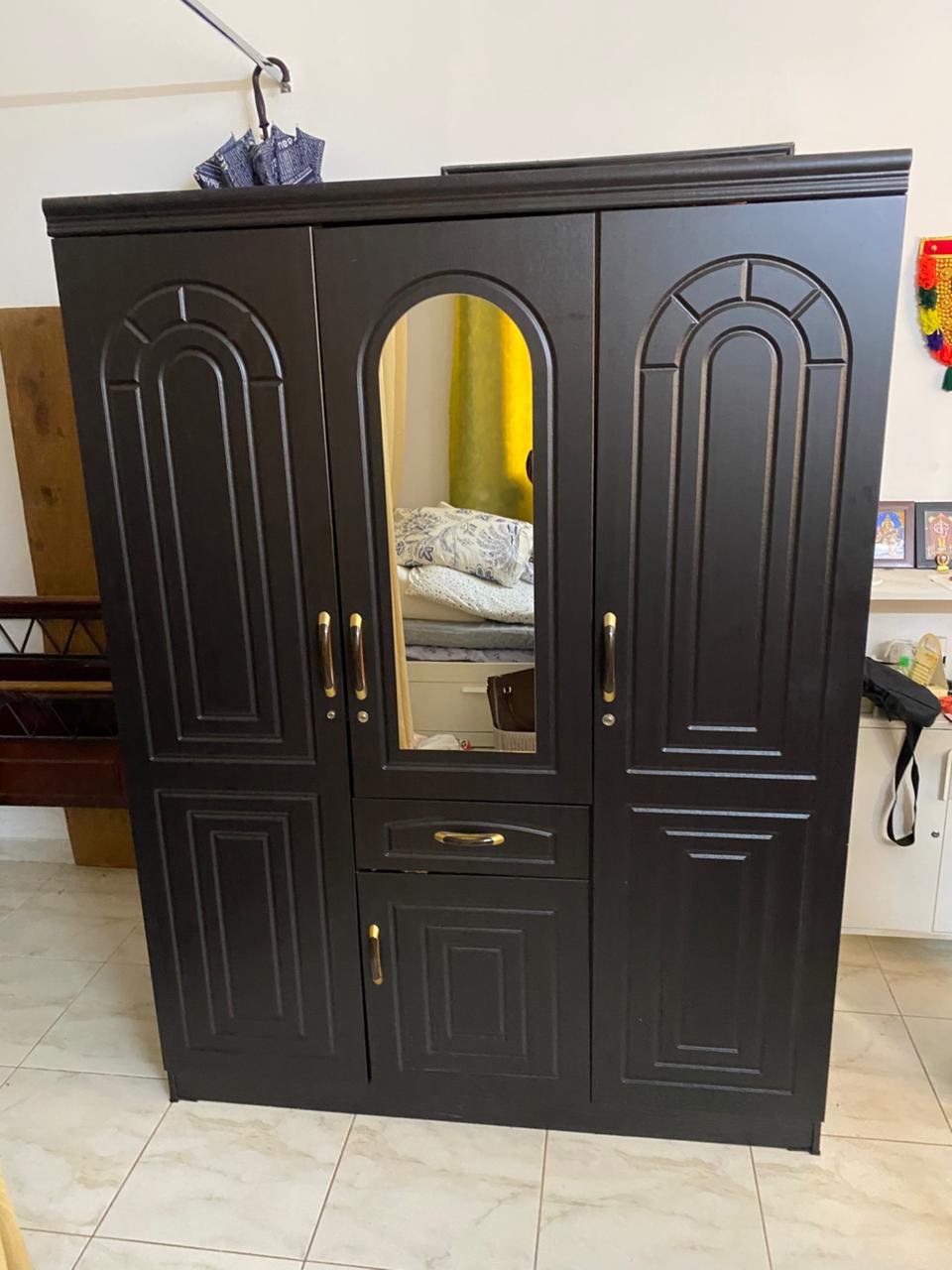 IKEA 3-Door Wardrobe | Elegant Dark Brown with Gold Accents & Mirror