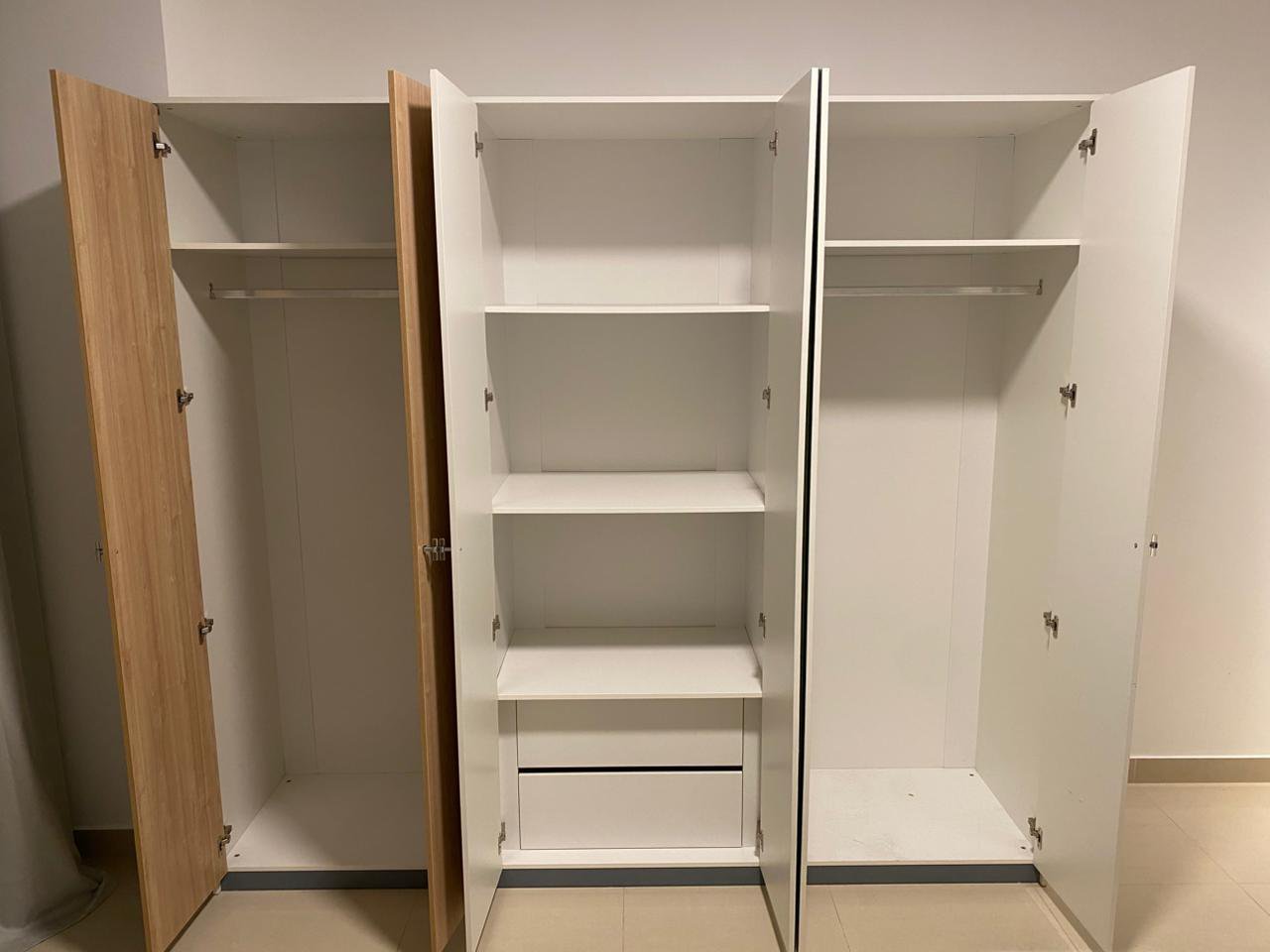 Maximize your storage and style with this stunning 6-door wardrobe from Pan Home. Expertly crafted with a blend of wood grain and white finishes, this spacious wardrobe includes two full-length mirrored doors, two solid white doors, and two wood-finish doors—creating a balanced and modern look. Inside, you’ll find a versatile layout with dedicated hanging sections and adjustable shelving, perfect for organizing clothing, accessories, and more. In excellent condition after only 8 months of use, this wardrobe offers premium functionality and design at an unbeatable value.
