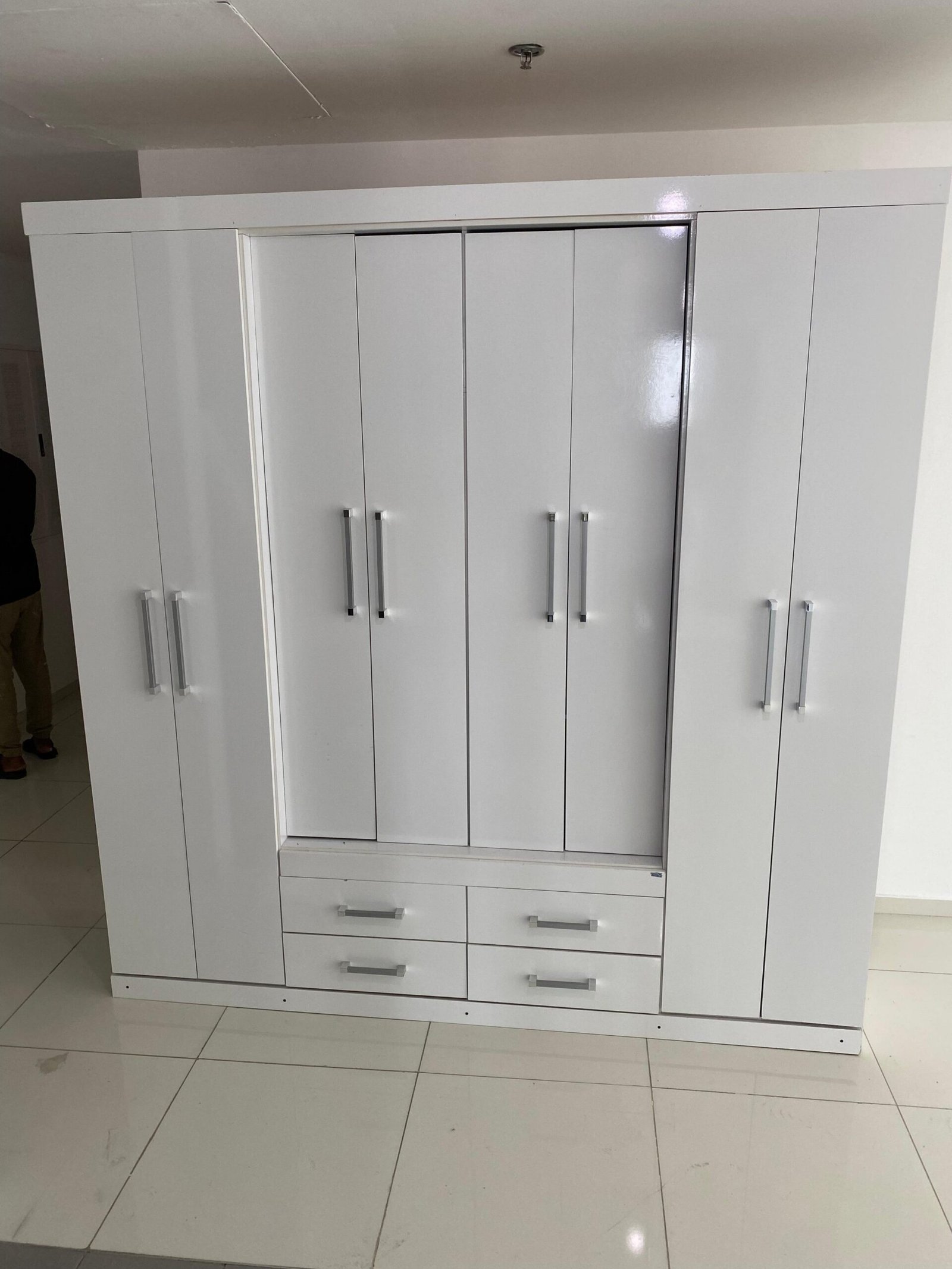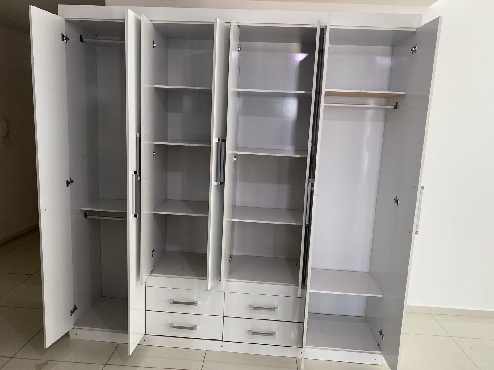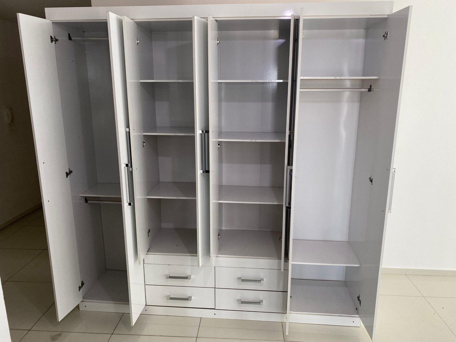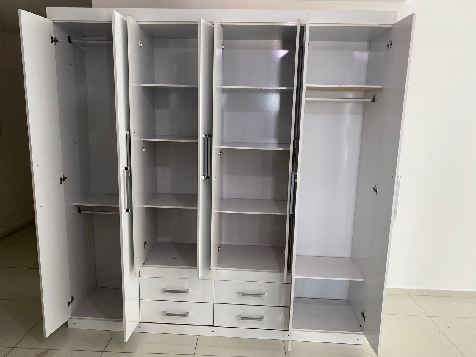 ✔ Combination of Doors & Drawers – Features six upper hinged doors and four lower drawers, all fitted with silver handles for a polished look.
